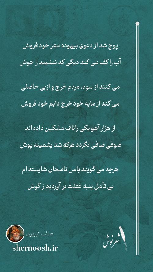 1 پوچ شد از دعوی بیهوده مغز خود فروش آب را کف می کند دیگی که ننشیند ز جوش