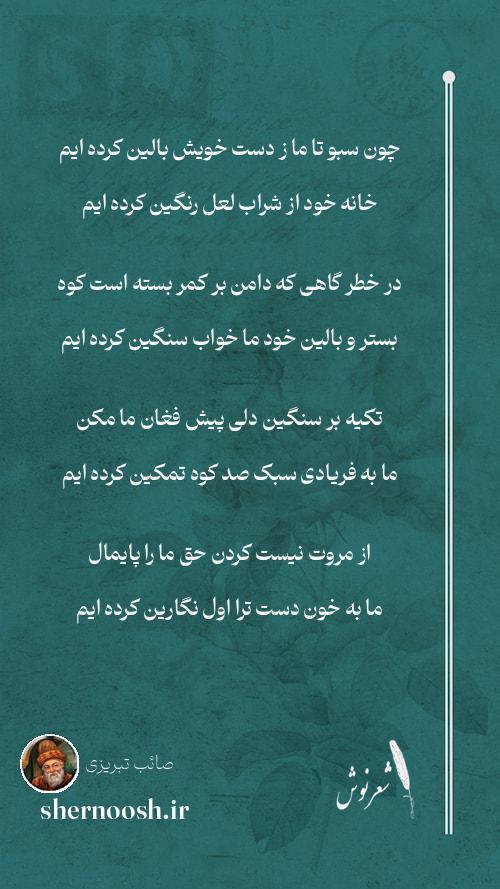 3 تکیه بر سنگین دلی پیش فغان ما مکن ما به فریادی سبک صد کوه تمکین کرده ایم
