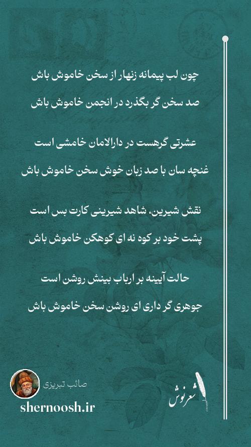 1 چون لب پیمانه زنهار از سخن خاموش باش صد سخن گر بگذرد در انجمن خاموش باش