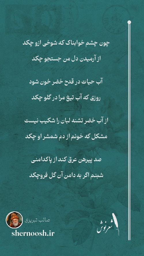 9 صائب ز دل برون ندهم اشک و آه را آن غنچه نیستم که ز من رنگ وبو چکد