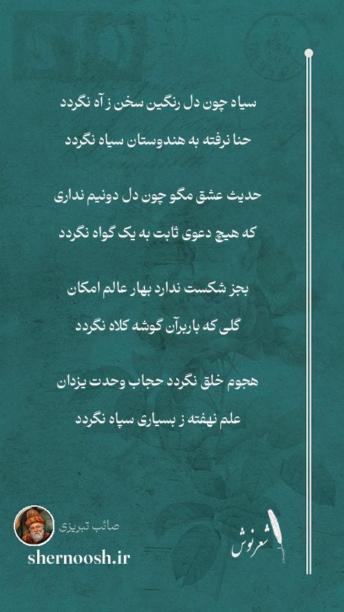 1 سیاه چون دل رنگین سخن ز آه نگردد حنا نرفته به هندوستان سیاه نگردد