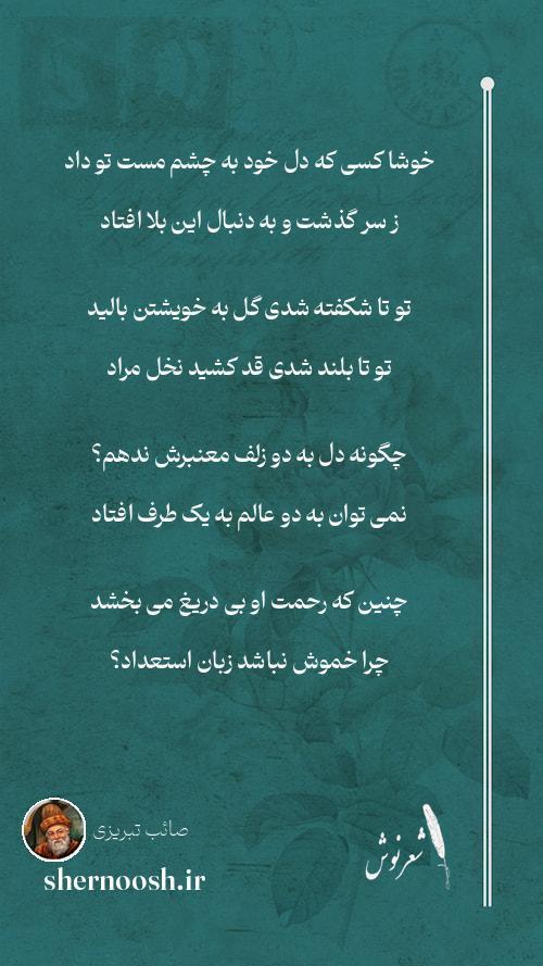 8 هنوز از جگر چاک بیستون صائب به گوش می رسد آواز تیشه فرهاد
