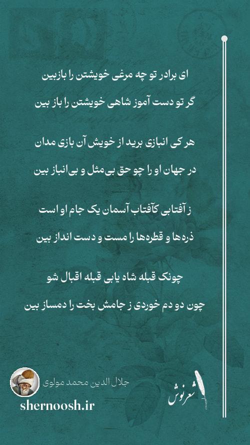 1 ای برادر تو چه مرغی خویشتن را بازبین گر تو دست آموز شاهی خویشتن را باز بین
