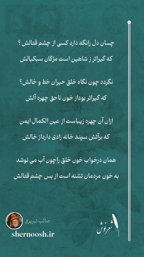 4 همان درخواب خون خلق راچون آب می نوشد به خون مردمان تشنه است از بس چشم قتالش