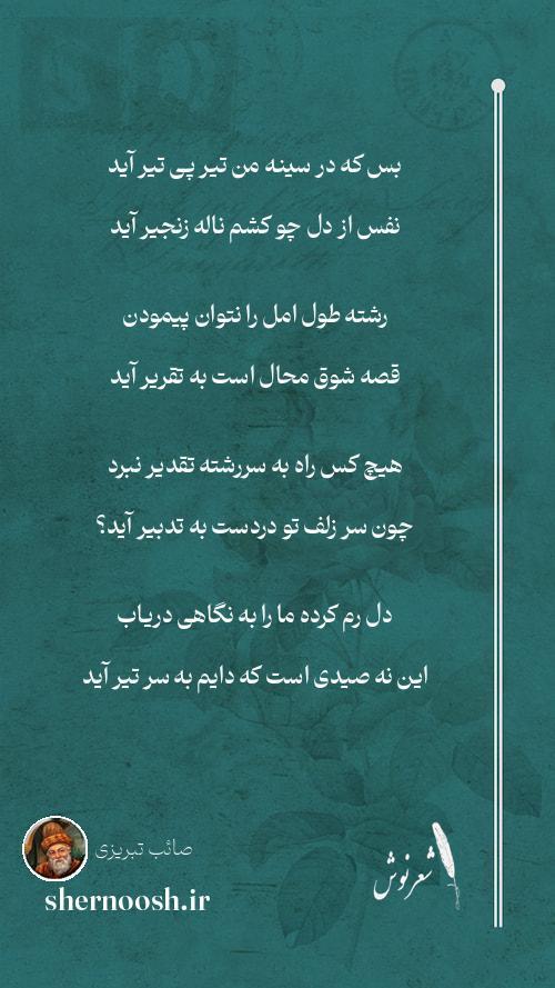 1 بس که در سینه من تیر پی تیر آید نفس از دل چو کشم ناله زنجیر آید
