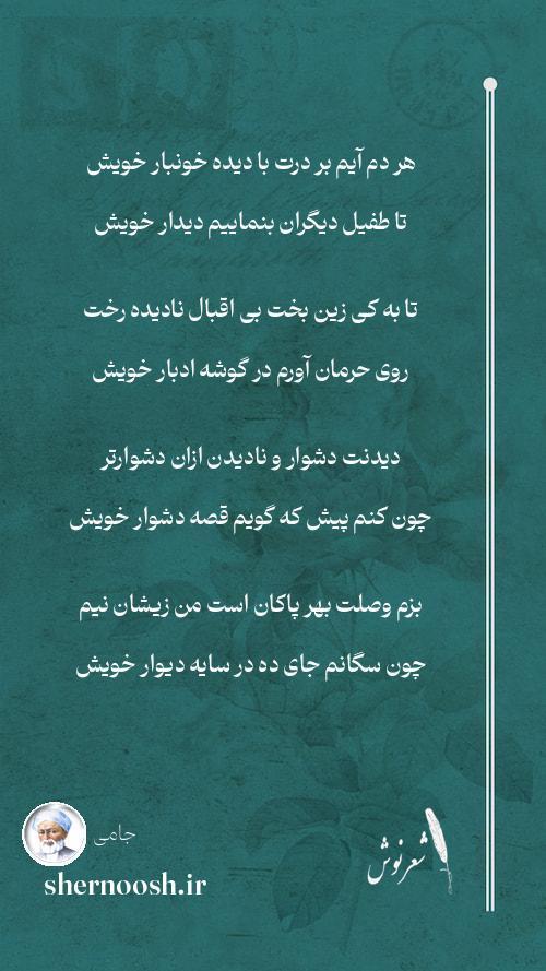7 کار جامی عشق خوبان است و هر سو عالمی در پی انکار او و او همچنان در کار خویش