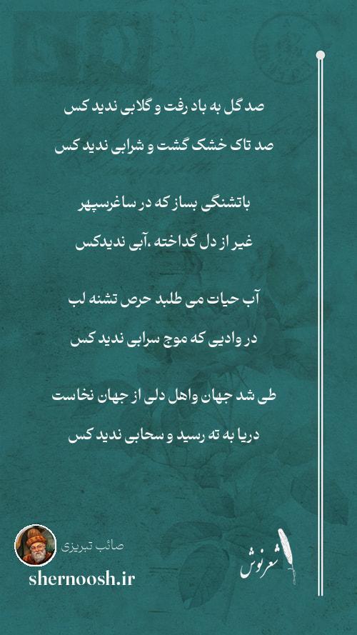 1 صد گل به باد رفت و گلابی ندید کس صد تاک خشک گشت و شرابی ندید کس