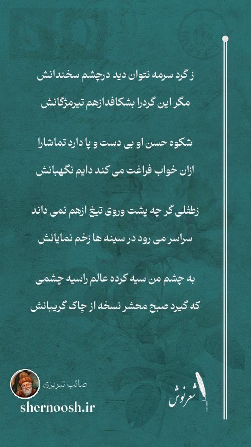 9 مرا سیمین بری آتش به خرمن می زند صائب که برگ گل نماید کار اخگر درگریبانش