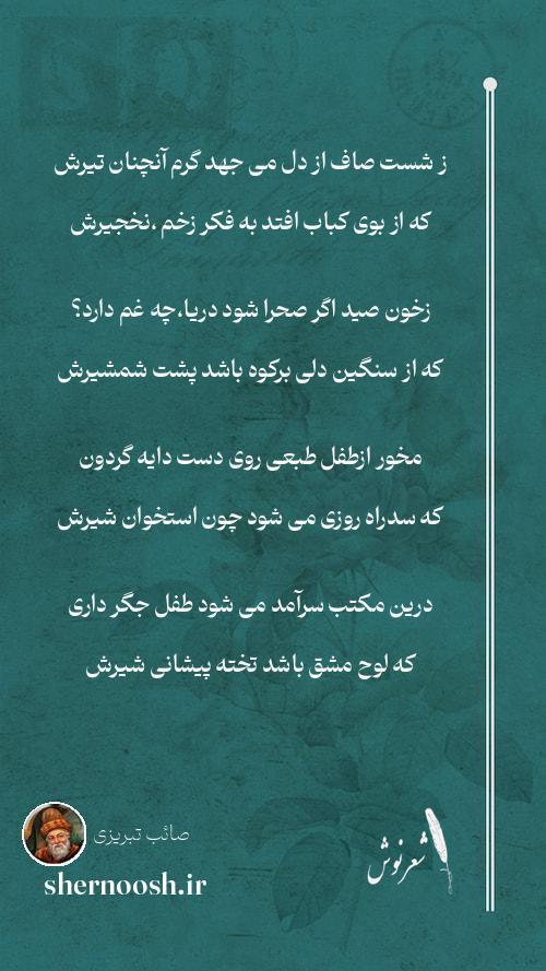 1 ز شست صاف از دل می جهد گرم آنچنان تیرش که از بوی کباب افتد به فکر زخم ،نخجیرش