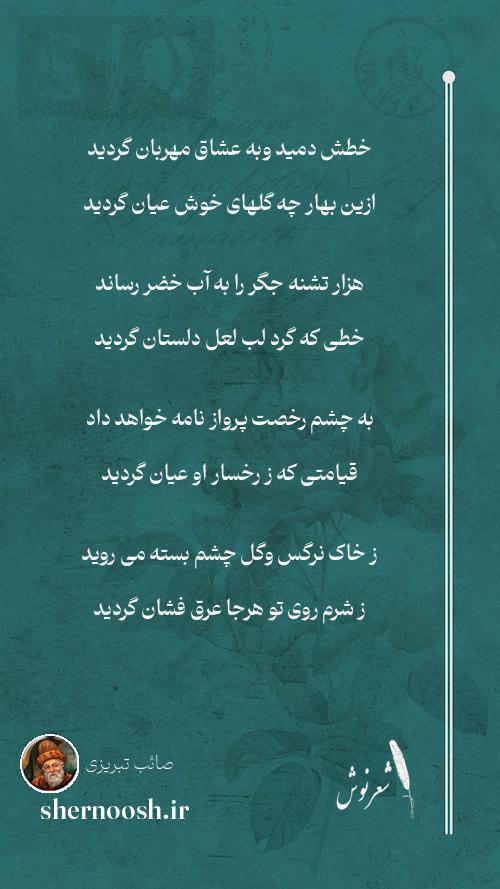 1 خطش دمید وبه عشاق مهربان گردید ازین بهار چه گلهای خوش عیان گردید
