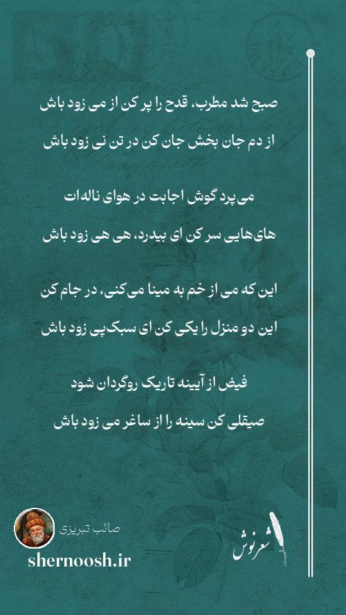 6 تا به خود جنبیدهای از دست فرصت رفته است جام را پر، شیشه را خالی کن از می زود باش