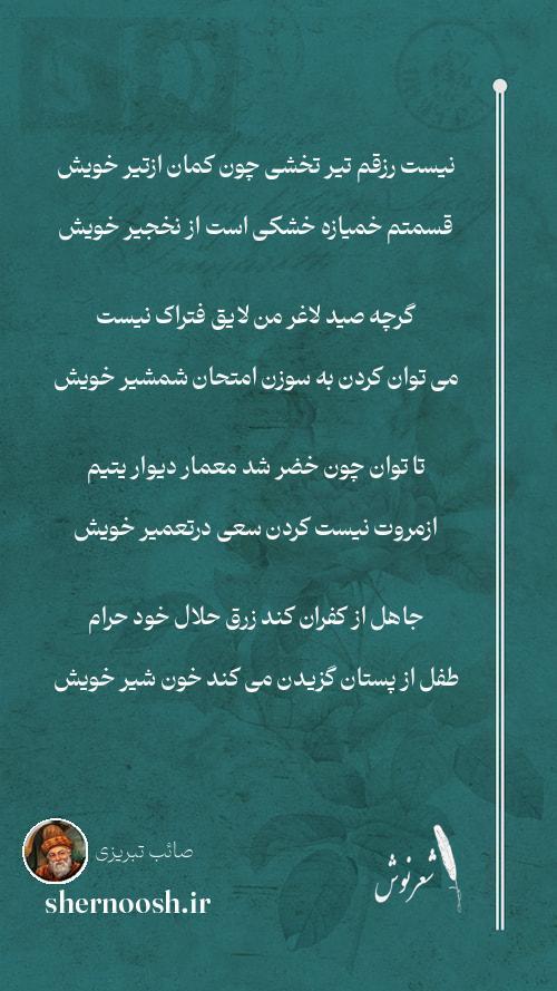 1 نیست رزقم تیر تخشی چون کمان ازتیر خویش قسمتم خمیازه خشکی است از نخجیر خویش