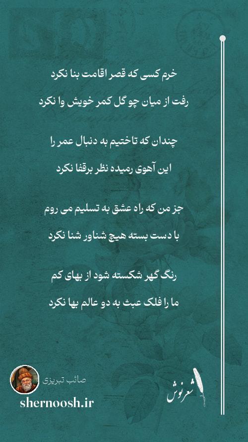 1 خرم کسی که قصر اقامت بنا نکرد رفت از میان چو گل کمر خویش وا نکرد