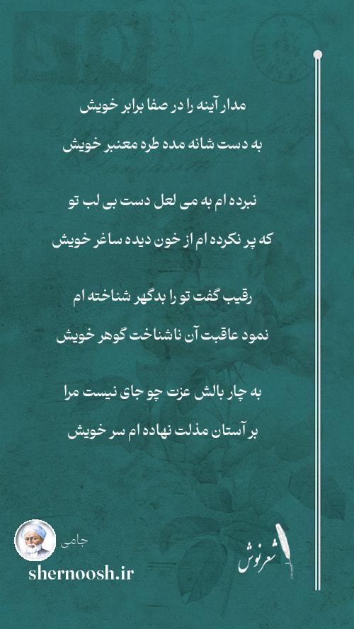 7 هجوم عشق تو دیوانه ساخت جامی را شکست کلک و بر آتش نهاد دفتر خویش