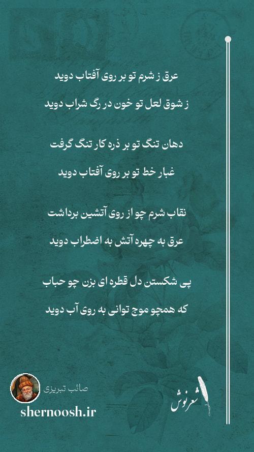1 عرق ز شرم تو بر روی آفتاب دوید ز شوق لعل تو خون در رگ شراب دوید