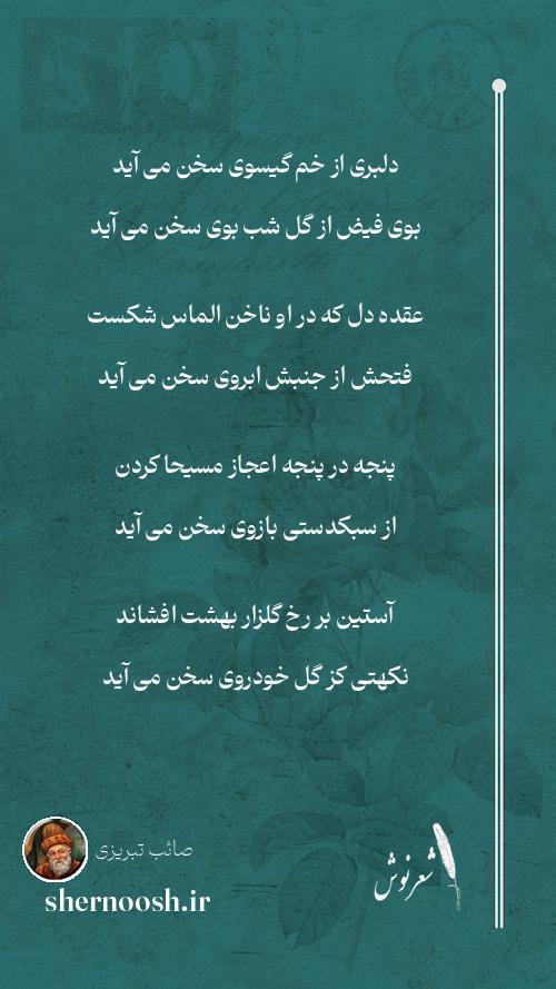 6 صائب از دست منه کلک گهربارت را این نهالی است کز او بوی سخن می آید