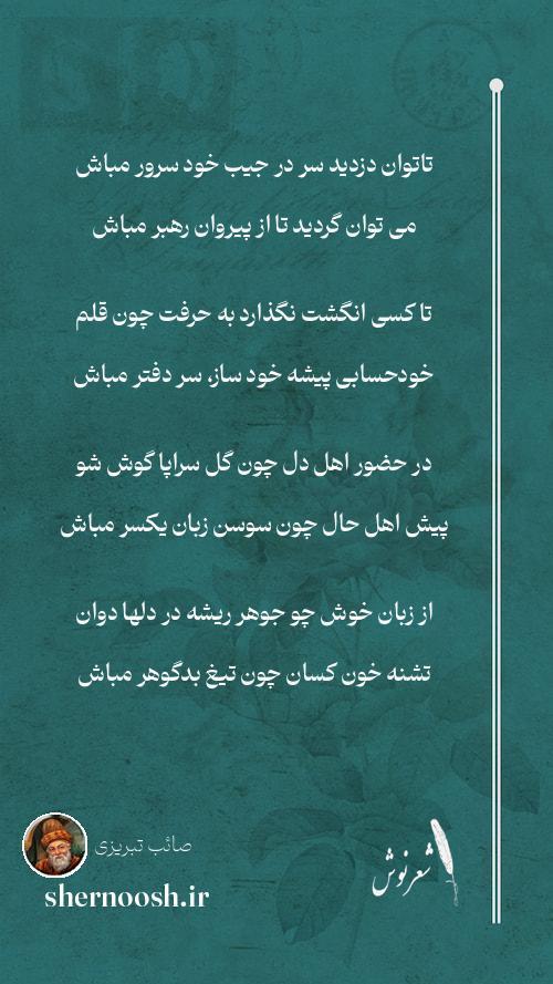 12 تا به خون خود نسازی تشنه صائب خلق را از رگ گردن به چشم مردمان نشتر مباش