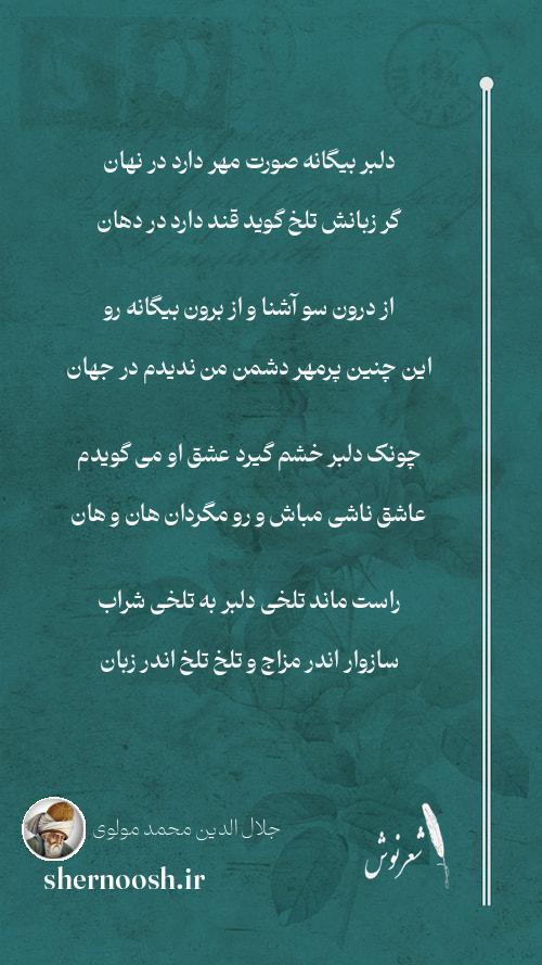 1 دلبر بیگانه صورت مهر دارد در نهان گر زبانش تلخ گوید قند دارد در دهان