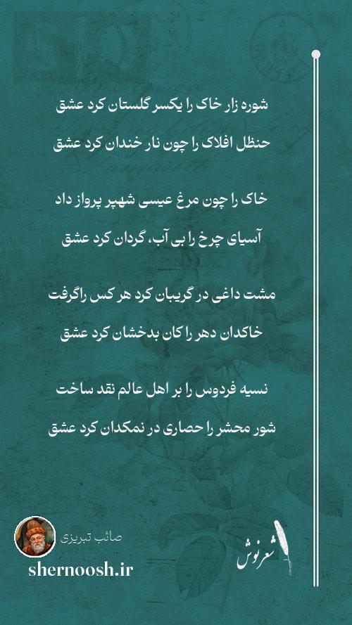 1 شوره زار خاک را یکسر گلستان کرد عشق حنظل افلاک را چون نار خندان کرد عشق