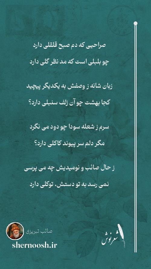 4 ز حال صائب و نومیدیش چه می پرسی نمی رسد به تو دستش، توکلی دارد