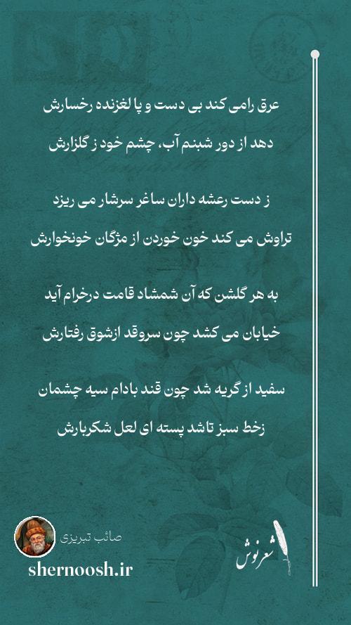 1 عرق رامی کند بی دست و پا لغزنده رخسارش دهد از دور شبنم آب، چشم خود ز گلزارش