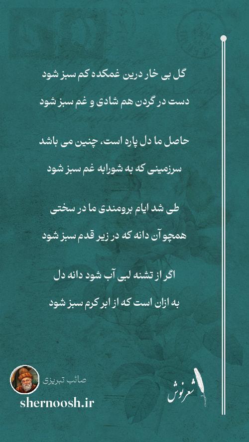 12 از سخنهای تو صائب که ازو آب چکد عجبی نیست اگر لوح و قلم سبز شود