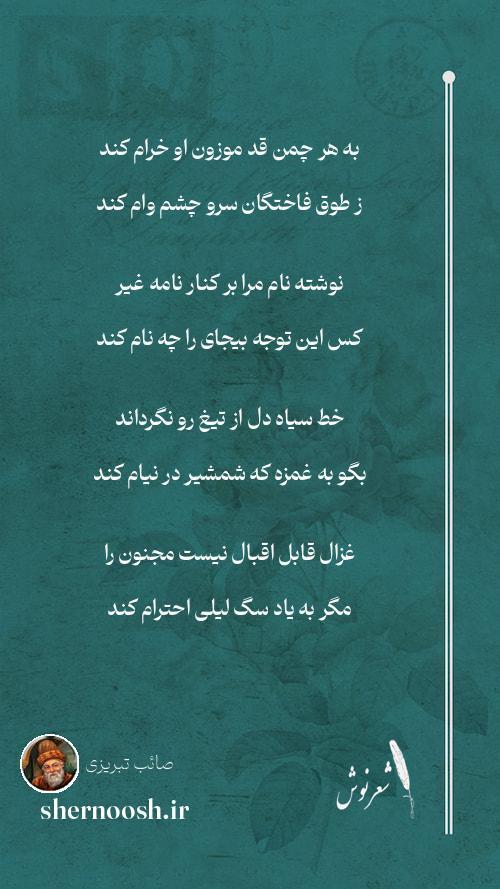 13 اگر چو تیر قلم پر برآوردصائب عجب که نامه شوق مرا تمام کند
