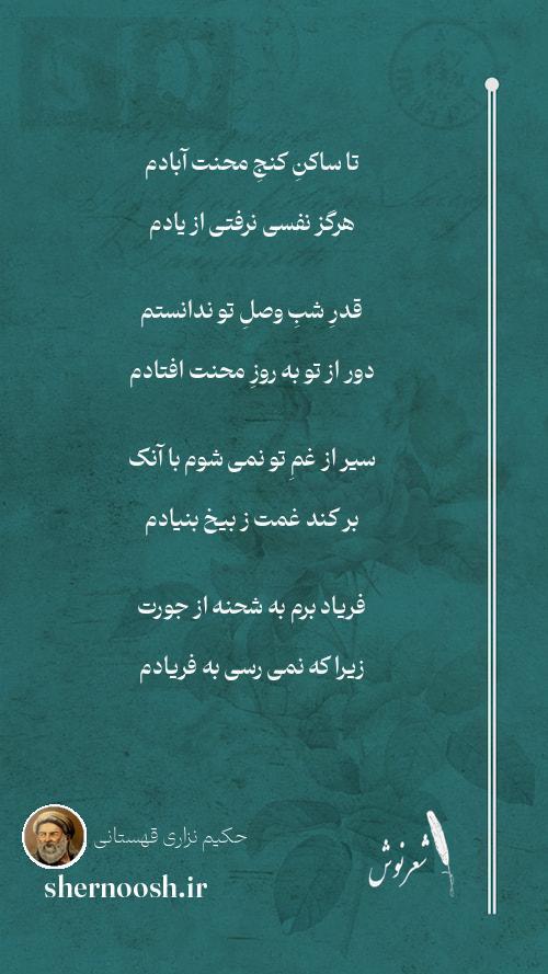 1 تا ساکنِ کنجِ محنت آبادم هرگز نفسی نرفتی از یادم