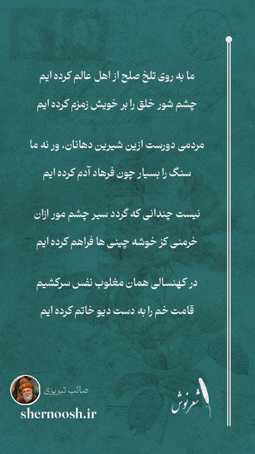 1 ما به روی تلخ صلح از اهل عالم کرده ایم چشم شور خلق را بر خویش زمزم کرده ایم