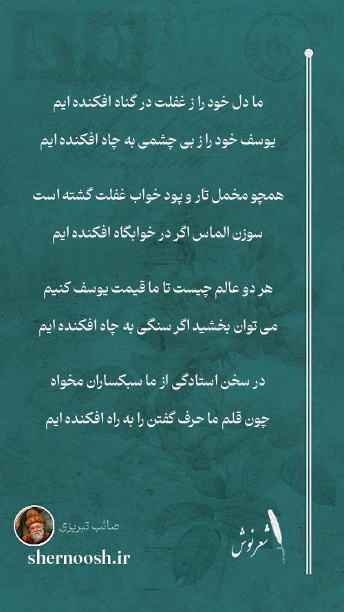 1 ما دل خود را ز غفلت در گناه افکنده ایم یوسف خود را ز بی چشمی به چاه افکنده ایم