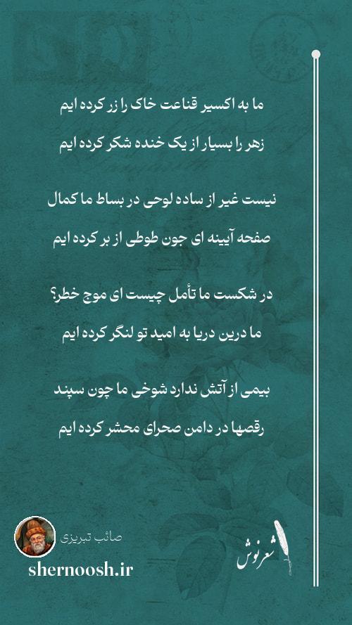 1 ما به اکسیر قناعت خاک را زر کرده ایم زهر را بسیار از یک خنده شکر کرده ایم