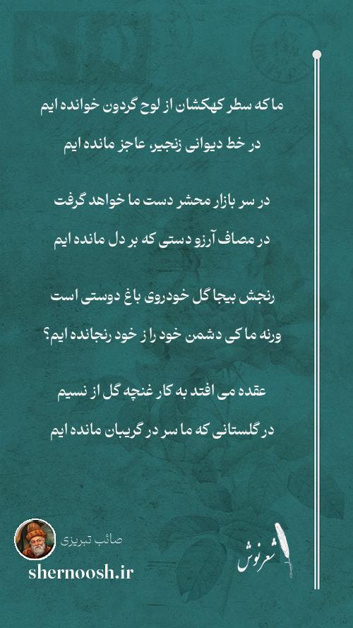1 ما که سطر کهکشان از لوح گردون خوانده ایم در خط دیوانی زنجیر، عاجز مانده ایم