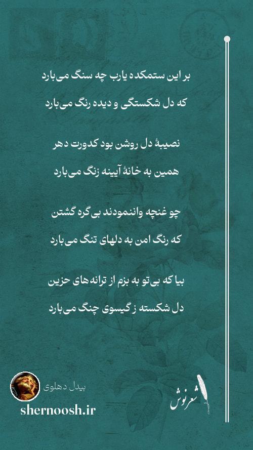 1 بر این ستمکده یارب چه سنگ میبارد که دل شکستگی و دیده رنگ میبارد