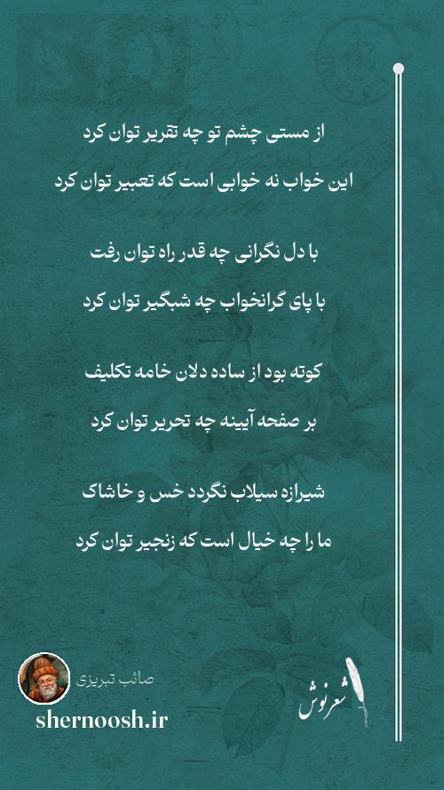 1 از مستی چشم تو چه تقریر توان کرد این خواب نه خوابی است که تعبیر توان کرد