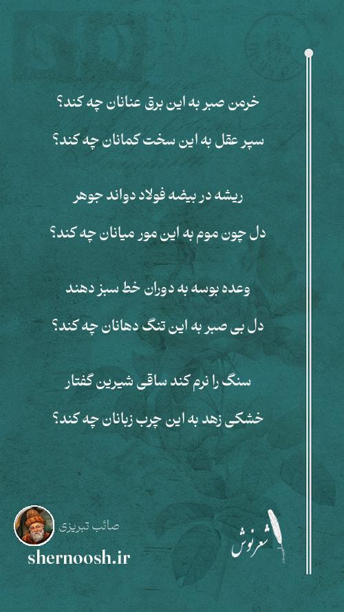 1 خرمن صبر به این برق عنانان چه کند؟ سپر عقل به این سخت کمانان چه کند؟