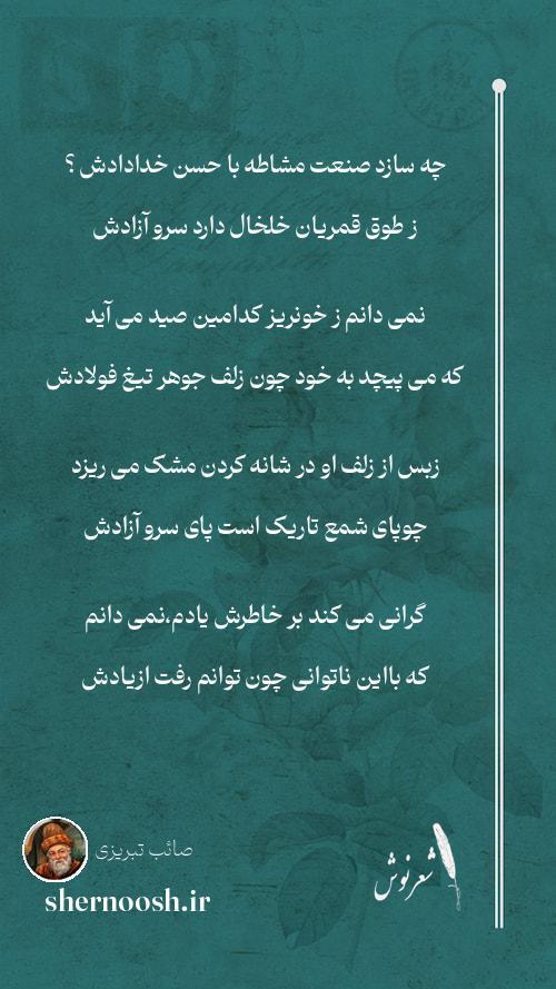 3 زبس از زلف او در شانه کردن مشک می ریزد چوپای شمع تاریک است پای سرو آزادش