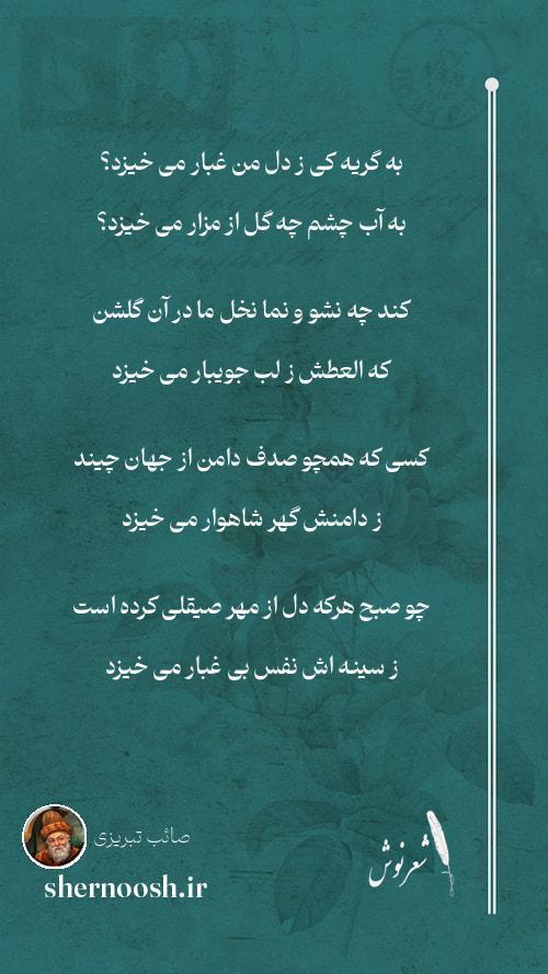 13 که چشم کرد دل داغدار صائب را؟ که دود تلخی ازین لاله زار می خیزد