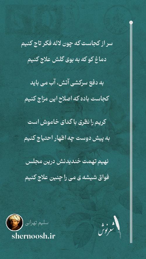 1 سر از کجاست که چون لاله فکر تاج کنیم دماغ کو که به بوی گلش علاج کنیم