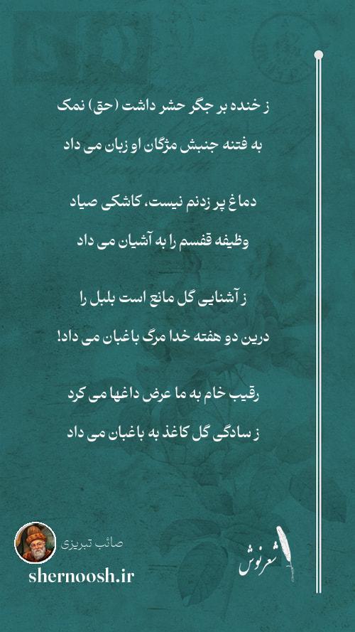 8 چو صائب این غزل تازه را رقم می زد هزار بوسه به کلک شکر زبان می داد